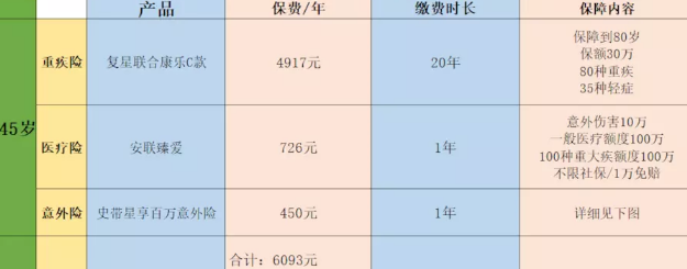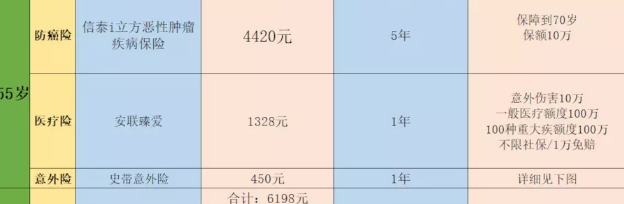 主要基于6000元每年保費的預(yù)算,45歲和50歲的重大疾病保險計劃采用消費型嚴重的疾病風(fēng)險。在55歲時,它是防癌險,價格比重疾險便宜,抗癌健康告知更放松。一些有身體狀況的父母更容易通過核保。