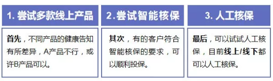 線上產(chǎn)品和智能核保都行不通,最后還可以進行人工核保,目前線上/線下都可以,通過人工核保,得到最終的結(jié)果。