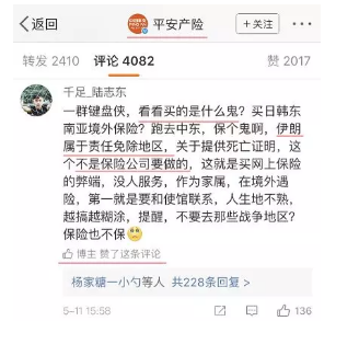 不僅如此,在這條微博下面,平安產(chǎn)險的官方微博點贊了一條評論: