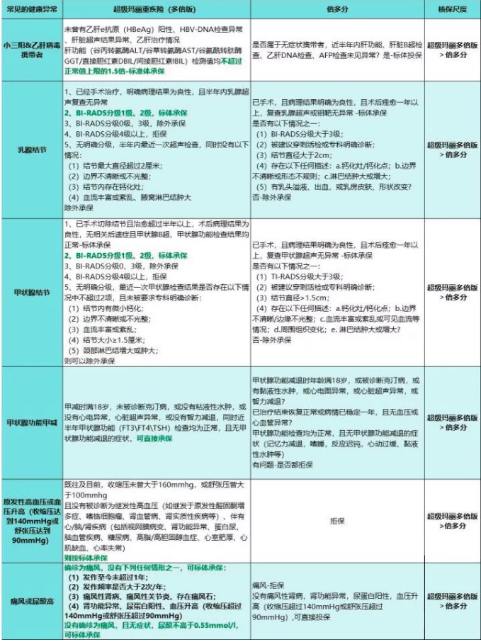 并且甲狀腺結節(jié)、乳腺結節(jié)1-2級可標體承保,乙肝小三陽、高血壓、痛風和甲減等滿足條件也是可以標準體承保的。