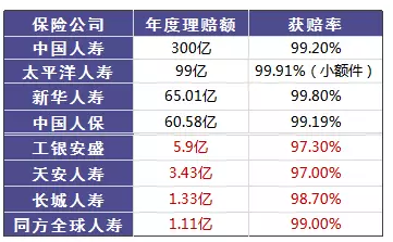 我們來看幾個(gè)保險(xiǎn)公司發(fā)布的理賠率:消費(fèi)者申請(qǐng)理賠后,保險(xiǎn)公司理賠的概率有多少。