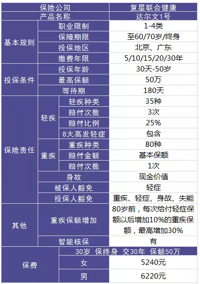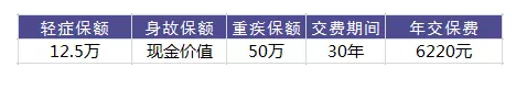 張先生今年30周歲,購買達爾文1號,重疾保險金額50萬元,輕癥疾病保險金額12.5萬元,交30年,保險期間保至終身,每年繳納保費6220元。