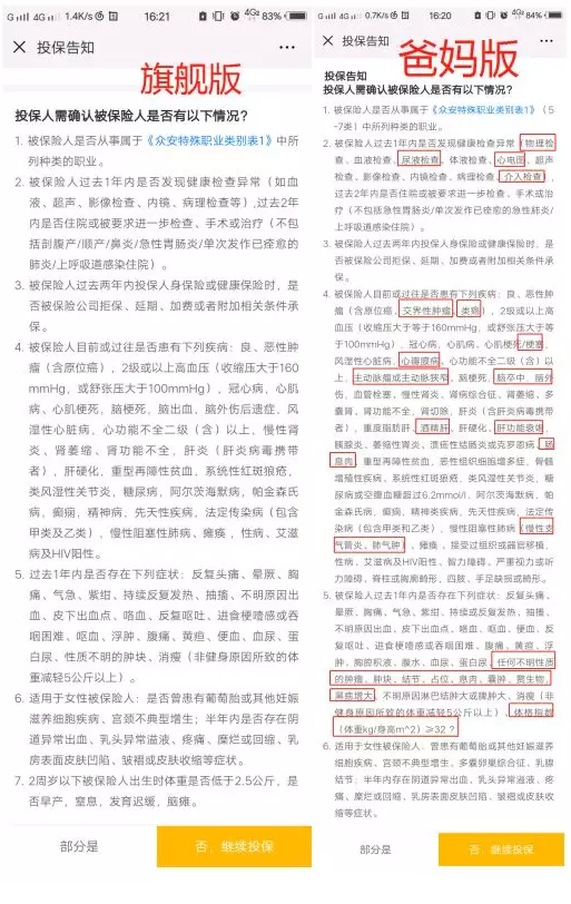 所以,在健康告知的設(shè)置上,爸媽版要比旗艦版更加嚴(yán)格一些。