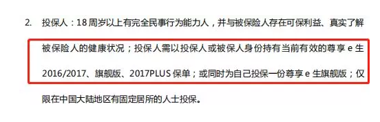 “投保人需以投保人或被保人身份持有當(dāng)前有效的尊享e生2016/2017、旗艦版、2017PLUS保單;或同時為自己投保一份尊享e生旗艦版”