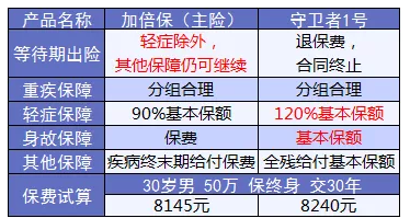 輕癥保障上,“守衛(wèi)者1號(hào)”的賠付比“加倍保”多出30%保額,優(yōu)勢(shì)更大。