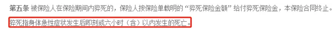 條款規(guī)定,只要在6個(gè)小時(shí)內(nèi)發(fā)生的死亡都可以作為猝死來(lái)賠付。