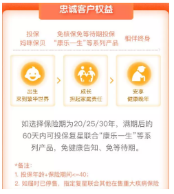 另外,因?yàn)楸U掀谙蘅梢赃x擇定期,所以復(fù)星聯(lián)合做了一個(gè)“忠誠(chéng)客戶權(quán)益”的設(shè)計(jì):