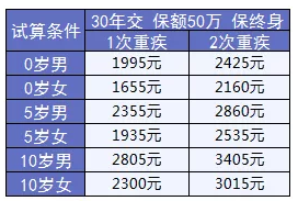 涵蓋重疾1次保障,輕癥、中癥各2次,分別賠付30%、50%基本保額。