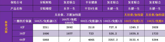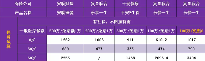 樂健一生組合方式比較多,首先看一下沒有附加社保的特需情況。同樣免賠額情況下年齡越小樂健一生保費越低。不要擔(dān)心保額100萬或200萬,這只是一個噱頭。