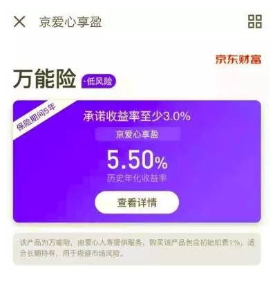 京東金融上面的京愛心享盈萬能險(xiǎn),持有五年保本和保證收入3%,歷史年化收益率為5.5%。在保本的基礎(chǔ)上,它也高于不保本投連險(xiǎn)。