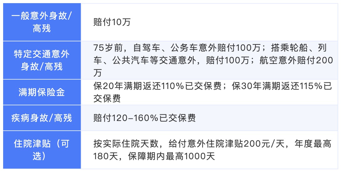 另外意外險(xiǎn)相比其它險(xiǎn)種很大一個(gè)優(yōu)勢(shì)在于殘疾是按等級(jí)分比例進(jìn)行賠付的,例如2級(jí)殘疾賠付保額的90%,并不是要求全殘才能賠。所以挑選產(chǎn)品的時(shí)候要看一般意外責(zé)任的保額要盡量高,而不要被航空保額300萬(wàn),郵輪保額300萬(wàn)這種低賠付率的責(zé)任吸引了眼球。