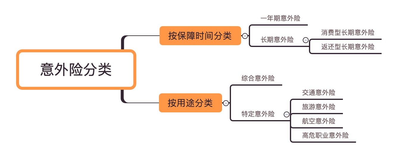雖然意外險(xiǎn)相比健康險(xiǎn)不算復(fù)雜,但是意外險(xiǎn)種類繁多,下圖從保障期限和用途對(duì)意外險(xiǎn)做了簡(jiǎn)單分類: