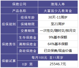 很多家長都熱衷于買教育金險,想給自己孩子存一筆錢,留著上學用,今天我們來說一款渤海人壽的教育金險——大富翁,也叫i寶貝教育金險,看看它好不好,值不值得買!