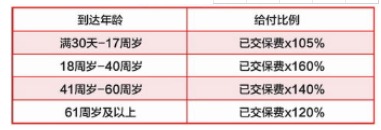 如果投保人30歲投保,不幸35歲身故,他交了10萬保費(fèi),那么保險(xiǎn)公司按照160%的已交保費(fèi)也就是16萬給付身故保險(xiǎn)金。如果他不幸45歲身故,那么身故保險(xiǎn)金為14萬。