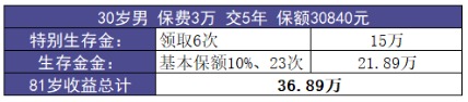 同樣按上面的表格條件進(jìn)行試算:當(dāng)被保人滿80周歲后還活著,那么保險公司按照年繳保費3萬的50%*繳費年期數(shù)5年=7.5萬特別生存金。