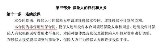 2.隔壁老王得了肺炎,愈合并且理賠,但仍有復(fù)發(fā),需要續(xù)保,但在提交申請(qǐng)時(shí)被拒絕。為什么?因?yàn)檫@個(gè)醫(yī)療保險(xiǎn)不保證續(xù)保,讓我們來(lái)看看大多數(shù)醫(yī)療保險(xiǎn)的續(xù)保條款內(nèi)容:
