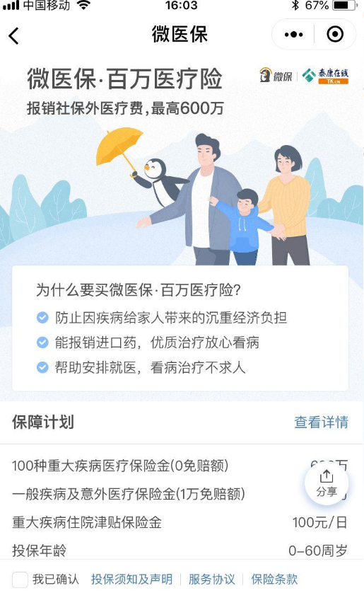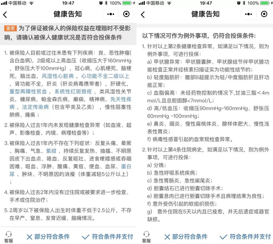 就是我們這個(gè)產(chǎn)品是多少錢,保多長時(shí)間(保障期),誰能買(健康告知嚴(yán)格不嚴(yán)格)。微保產(chǎn)品可以輕松支付每月/每年的付款,即使使用信用卡,這是非常好的。這個(gè)醫(yī)療保險(xiǎn)是一年期間,與市場上的大多數(shù)產(chǎn)品相同(但也有5年保證續(xù)保產(chǎn)品:復(fù)星合并樂享一生萬醫(yī)療保險(xiǎn)產(chǎn)品分析)。無論保障如何,產(chǎn)品都是全面的。如果只有少數(shù)人可以購買它,也會(huì)覺得是渣渣。我們來看看這個(gè)產(chǎn)品的健康告知:
