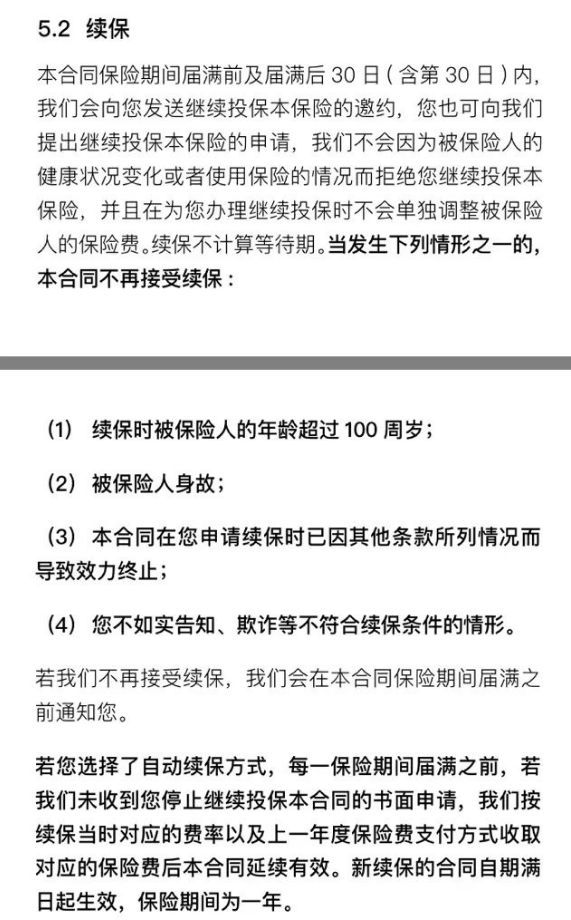 醫(yī)療保險(xiǎn)的另一個(gè)關(guān)鍵問題是:續(xù)保。這個(gè)產(chǎn)品的續(xù)保條款是這樣寫的: