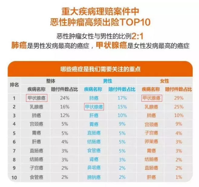 在癌癥理賠中,甲狀腺癌是一種高發(fā)病種,無論是男性還是女性: