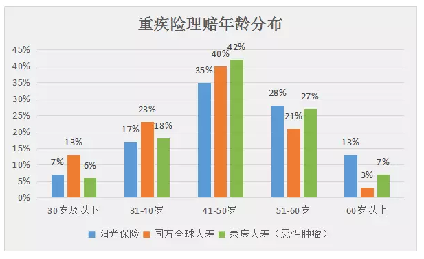 下面是陽光保險、同方全球人壽、泰康人壽的重疾年齡分布: