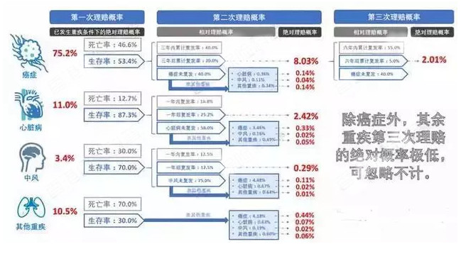 2)心臟病后第二次心臟復(fù)發(fā)的概率為2.42%;所有其他責(zé)任,無(wú)論是患有癌癥和其他嚴(yán)重疾病,還是患有其他嚴(yán)重疾病和癌癥,都不會(huì)超過(guò)2%。
