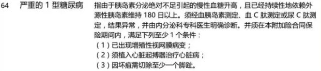 以糖尿病為例,平安福2018年“嚴(yán)重I型糖尿病”的補償條件如下圖所示: