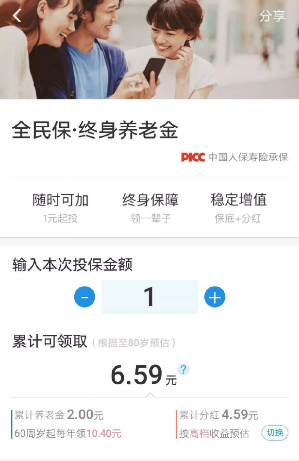 支付寶全民保·終身養(yǎng)老金,條款名叫:人保壽險(xiǎn)聚財(cái)保養(yǎng)老年金險(xiǎn)(分紅型)。背后的承保公司是中國(guó)人保集團(tuán)的“人民人壽保險(xiǎn)公司”,支付寶和他結(jié)合,可以被視為一個(gè)強(qiáng)大的聯(lián)盟。