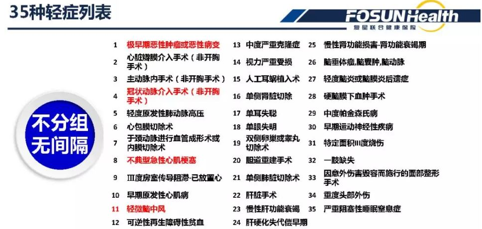 1、復星組合小保倍35種輕癥疾病包含輕癥,對應于大多數(shù)高風險或相對高風險的輕疾。這確實更好。當然,我們必須知道所謂的輕癥也是一種非常嚴重的疾病,而不是日常小病。