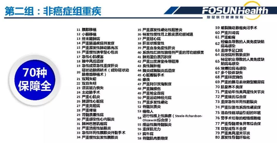 80種疾病分為2組。第一組10種疾病,包括惡性腫瘤、主要器官移植或造血干細胞移植、終末期腎病三大高危重大疾??;第二組70種疾病包括急性心肌梗死、腦中風后遺癥、冠狀動脈搭橋術3種高發(fā)疾病。