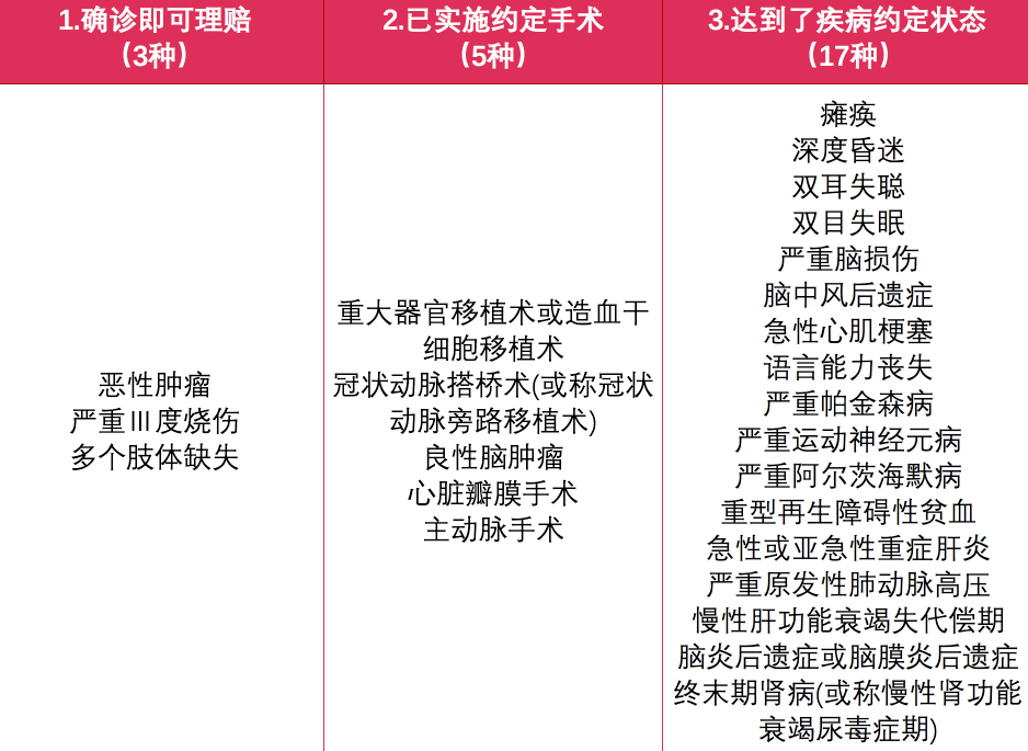 疾病的賠付大致分為3類:確診就可以理賠,已經(jīng)實(shí)施了約定的手術(shù),并且達(dá)到了疾病約定狀態(tài)。