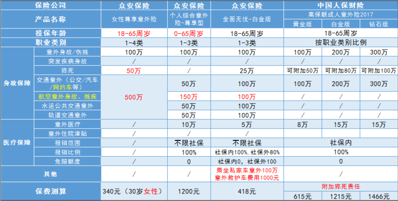 眾安全面無(wú)憂白金版的保證金額為100萬(wàn)。因此,多保魚在市場(chǎng)上選擇了幾款百萬(wàn)意外險(xiǎn),與全面無(wú)憂的白金版本進(jìn)行了橫向比較:
