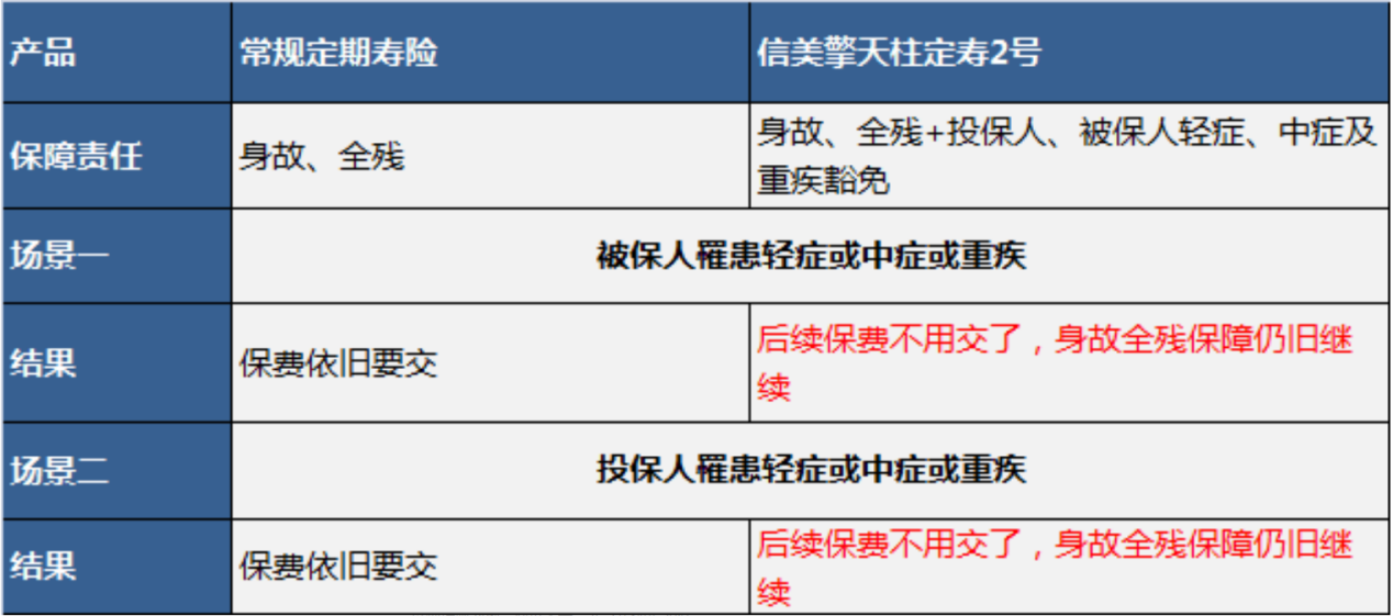 這也是該產(chǎn)品的最大亮點(diǎn)。這應(yīng)該是業(yè)內(nèi)第一次將重大疾病保險(xiǎn)的常見(jiàn)“保險(xiǎn)費(fèi)用豁免”功能移植到定期壽險(xiǎn)。必須說(shuō)信美人壽還是很有意思的。