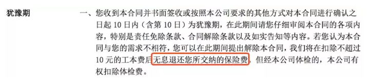 簡(jiǎn)單地說(shuō),在購(gòu)買(mǎi)保險(xiǎn)后的10天內(nèi),如果您認(rèn)為您購(gòu)買(mǎi)錯(cuò)了、后悔了、與代理商描述的不一樣;你可以在猶豫期內(nèi)隨時(shí)申請(qǐng)退保,保險(xiǎn)費(fèi)用完全撤退!如果您在線下購(gòu)買(mǎi),可能會(huì)扣除10元的費(fèi)用。如果猶豫期結(jié)束,即使被保險(xiǎn)人違約,損失也會(huì)相對(duì)較大。
