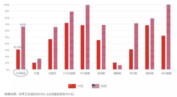 醫(yī)學上,5年生存概率通常用于衡量癌癥治療的效果。對于大多數(shù)癌癥治療,美國優(yōu)于中國。