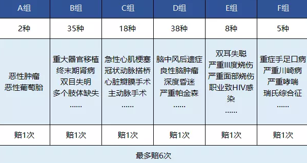 說到多次賠付重大疾病保險,常見產(chǎn)品將會對疾病分組,每組可以補償一次,這里以天安愛守護2019為例: