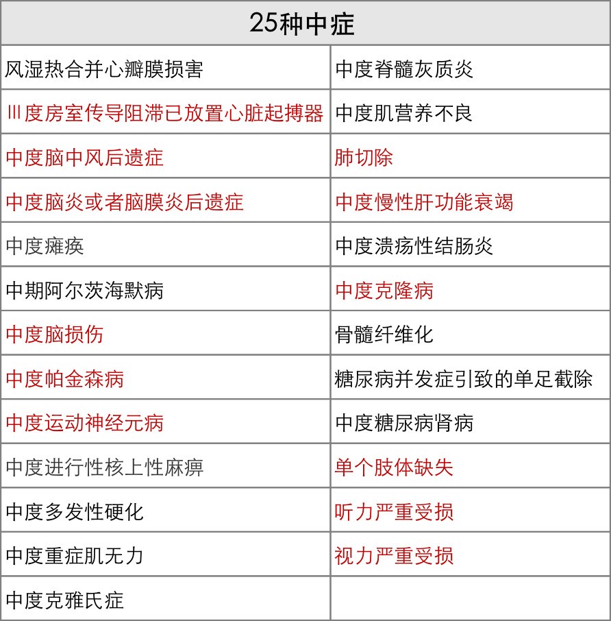 含中癥的三葉草比復(fù)星C稍微貴一些,主要原因在與三葉草有中癥保障,保額50%。且25種中癥里,有12種是復(fù)星C的輕癥。(標(biāo)紅部分,為復(fù)星C的輕癥)