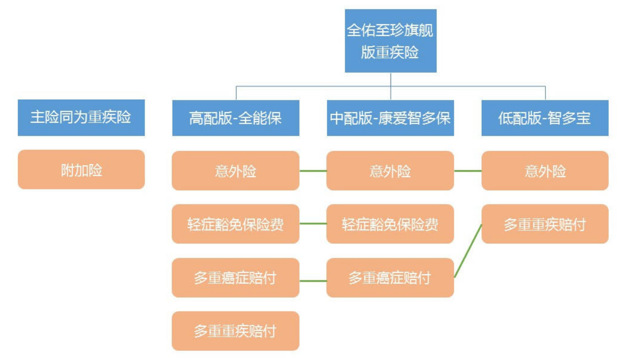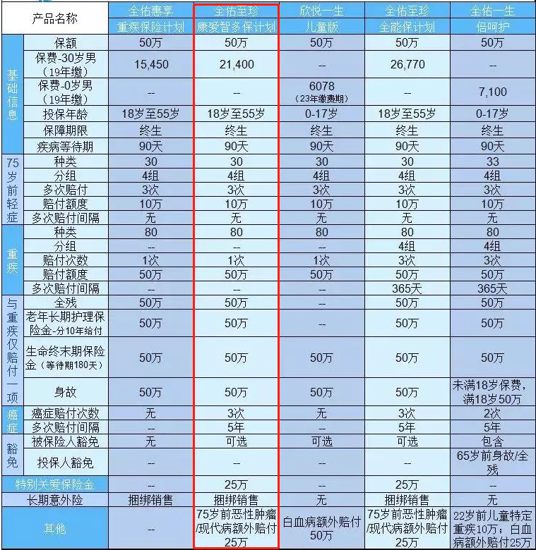 也就是說,主險(xiǎn)是重大疾病保險(xiǎn)的全佑至珍旗艦版其實(shí)共有三種產(chǎn)品:全佑至珍旗艦版康愛智多保計(jì)劃、全佑至珍旗艦版全能保計(jì)劃、全佑至珍旗艦版智多寶計(jì)劃康愛智多保的特征是輕癥豁免,以及多重癌癥賠付;而全能保的特點(diǎn)是添加了輕癥豁免、多重癌癥賠付、多重重疾病賠付,保障很“全能”。