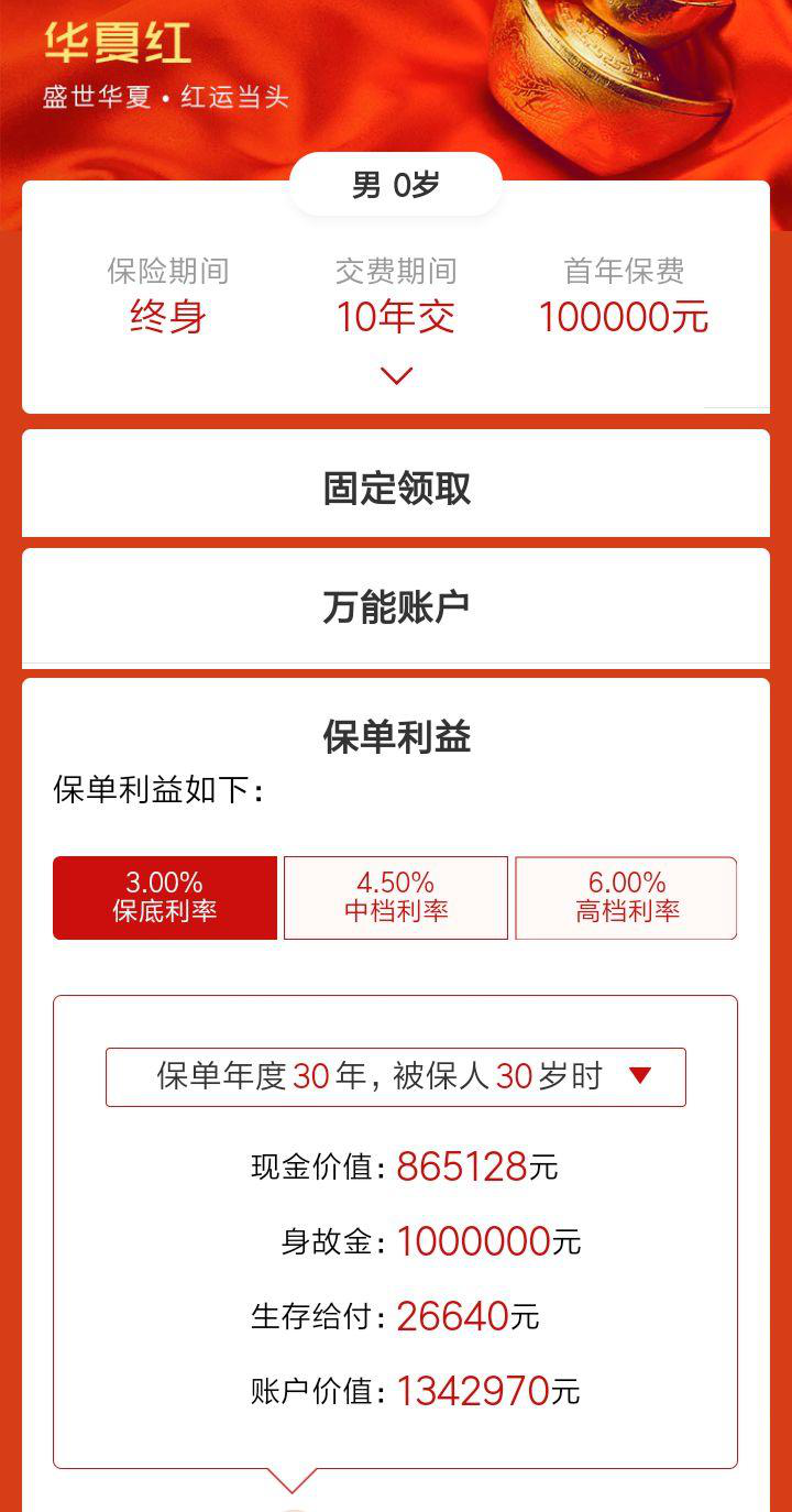 采用保底利率則為合同確定利率,如華夏萬(wàn)能保底為3.0%,太平萬(wàn)能保底利率為2.5%,平安萬(wàn)能保底利率為1.75%。