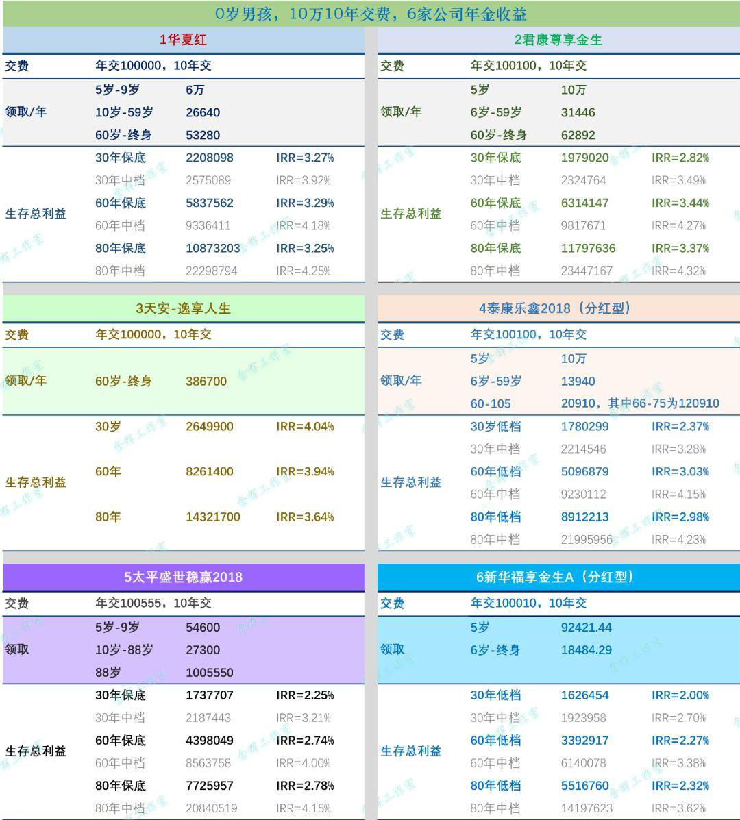 1、本文列舉6款產(chǎn)品,作分析,以0歲男孩,10年交每年10萬(wàn)為例。