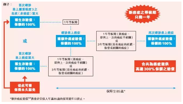 就首次因嚴(yán)重程度2或3之危疾已付或應(yīng)付生存賠償后,第一次從診斷日期開始的基本計(jì)劃的保費(fèi)將永久為豁免,并且被保險(xiǎn)人可以免費(fèi)享受保障至保單終止。
