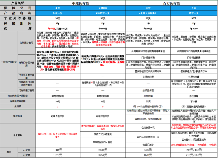 ? 隨著保險行業(yè)的不斷發(fā)展,醫(yī)療保險這個險種也是更新?lián)Q代非常的快,從最初的小額醫(yī)療保險,到后來的百萬醫(yī)療險,中端醫(yī)療保險,高端醫(yī)療險,海外醫(yī)療險等等。今天我們就來聊一聊最近非?;鸬陌偃f醫(yī)療險和終端醫(yī)療險分別是什么,已經(jīng)哪些人群適合百萬醫(yī)療險,哪些人群更適合中端醫(yī)療險。為了方便對比,下圖是中端醫(yī)療險和百萬醫(yī)療險的產(chǎn)品對比。