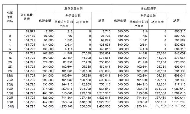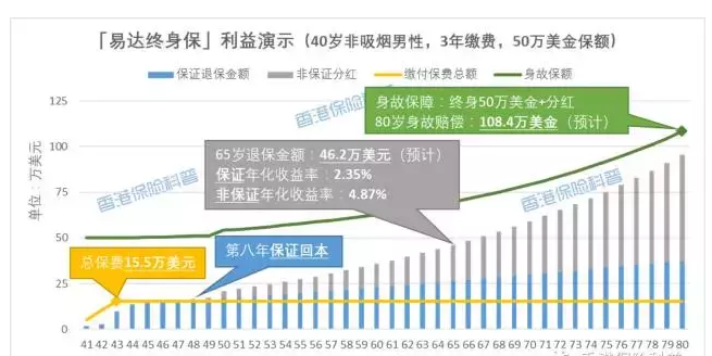 讓我們舉一個(gè)例子來(lái)看看「易達(dá)終身?!谷绾翁峁┮粋€(gè)帶有保單的“身故保障 +養(yǎng)老儲(chǔ)蓄+財(cái)富繼承”三種功效的。以下是該計(jì)劃的好處的示范(例如,一名40歲的非吸煙男子,死亡保額為0萬(wàn)美元,3年繳費(fèi),每年5175美元,以及總共保費(fèi),三年約155,000美元):