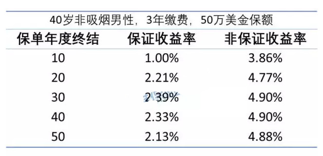 此外,上述收益沒(méi)有考慮到500,000美元壽險(xiǎn)保額的風(fēng)險(xiǎn)和成本。通常,我們購(gòu)買的純儲(chǔ)蓄產(chǎn)品都沒(méi)有死亡保障(即死亡補(bǔ)償=累計(jì)保費(fèi))。除了提供節(jié)省之外,「易達(dá)終身?!惯€提供了500,000美元的終身死亡保障,這相當(dāng)于將保險(xiǎn)人節(jié)省了一份定期壽險(xiǎn)的保費(fèi),而這部分成本也應(yīng)該包含在我們的保單收入中。如果我們將600,000美元的保額、20年平均值保費(fèi)定期壽險(xiǎn)添加到保單,則定期壽險(xiǎn)每年消耗905美元保費(fèi),即總保費(fèi)155,000美元的0.58%(= 905 / 155,000),這相當(dāng)于產(chǎn)品的真正的保證收益率與非保證產(chǎn)量將增加至少0.58%(用“至少”一詞表示,是考慮到產(chǎn)品提供的終身壽險(xiǎn)值超過(guò)定期壽險(xiǎn))。