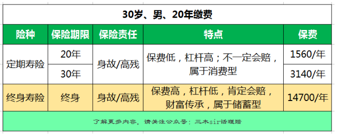 3、終身類型重大疾病保險具有死亡責任具有壽險功能,通常死亡保額不高,可以結(jié)合一個定期壽險,做足保額,定期壽險杠桿高、保費便宜。