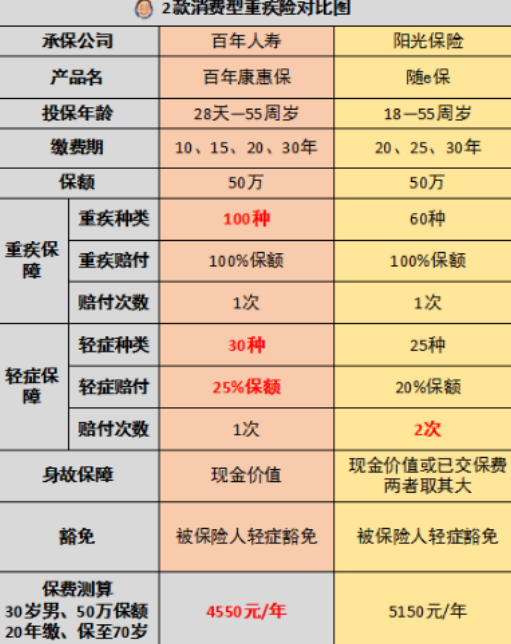 百年康惠保和陽(yáng)光隨e保進(jìn)行了比較。圖中的紅色字符是它們各自的優(yōu)點(diǎn)。