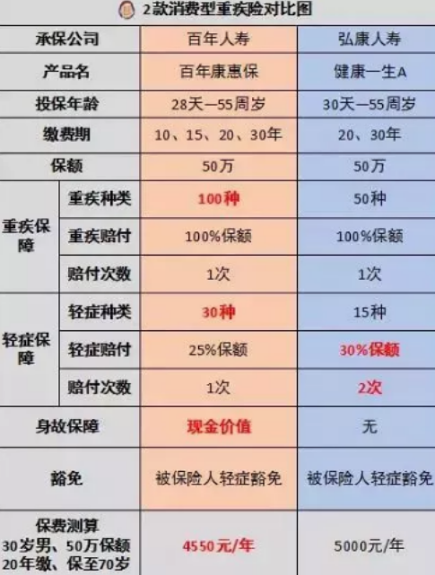 百年康惠保和健康一生A進(jìn)行比較。圖中的紅色字符各自具有優(yōu)勢(shì)。