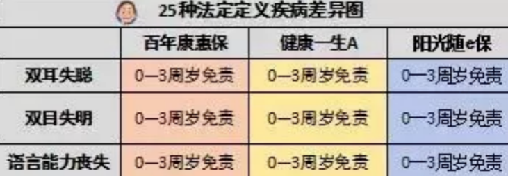 這三種產(chǎn)品在25種法定重疾理賠中具有相同的時(shí)間限制,例如“雙目失聰、雙耳失明、語(yǔ)言能力喪失”三種重疾所有都免于3歲以下。