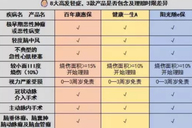 看來這三大產(chǎn)品的主要病癥、輕癥定義基本相同,輕癥中康惠保較小區(qū)域燒壞理賠比例,15%和10%實(shí)際上差別不大。