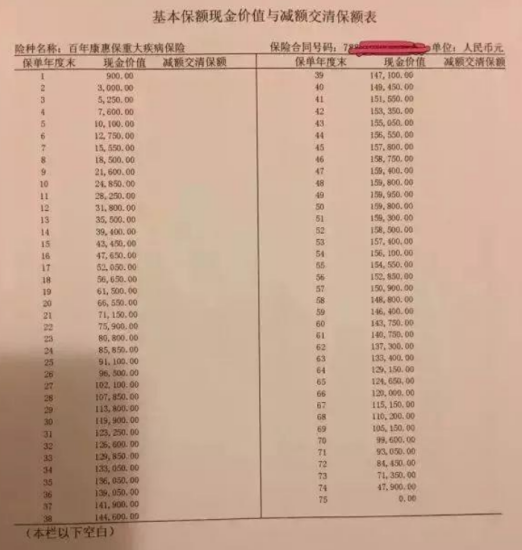 注意:百年康惠保的現(xiàn)金價(jià)值,上圖中的現(xiàn)金值表示每年可以返回的金額為退保的錢,減額交清則是在無法續(xù)交保費(fèi)時(shí),現(xiàn)金價(jià)值充當(dāng)保費(fèi)。