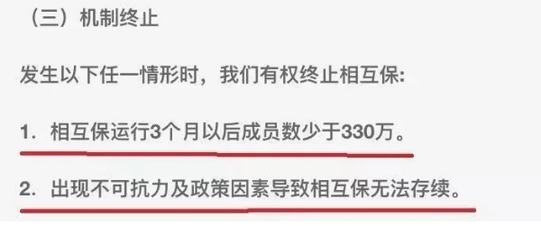 如果相互保連續(xù)三個(gè)月的參與成員數(shù)量少于330萬(wàn),或發(fā)生其他不可抗力,則該產(chǎn)品將終止。——注意它是“終止”,這意味著相應(yīng)的保障消失了。根據(jù)《保險(xiǎn)法》第89條、92條規(guī)定,市場(chǎng)上的其他嚴(yán)重疾病保險(xiǎn),只要用戶(hù)在保障期間被診斷患有嚴(yán)重疾病,無(wú)論保險(xiǎn)公司是否已經(jīng)關(guān)閉,用戶(hù)的權(quán)利都不會(huì)被終止。